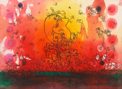 Yoshio Nakajima, “4 o’clock” (2016), Mixed media på plade, 94×120 cm.